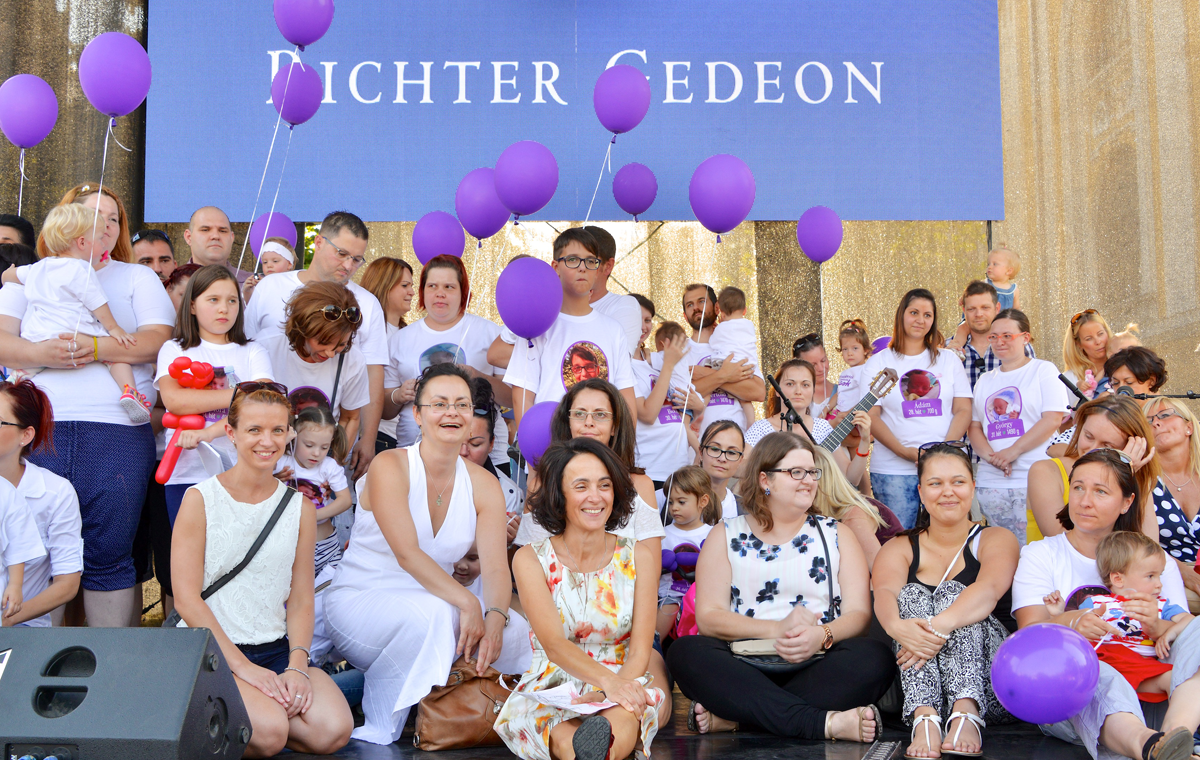 Délután Dr. Kelemen Edit neonatológus főorvosnő felhívására a nagyszínpadra álltak azok a gyermekek, akik koraszülöttként jöttek a világra vagy a koraszülött osztály betegei voltak a Bács-Kiskun Megyei Kórházban. Lila lufik alatt, különleges pólókban vonultak a legkisebb óriások és szüleik, nagyszüleik, hogy aztán Szabóné Csikai Ágnes zenepedagógus gitárkíséretével együtt énekeltek.